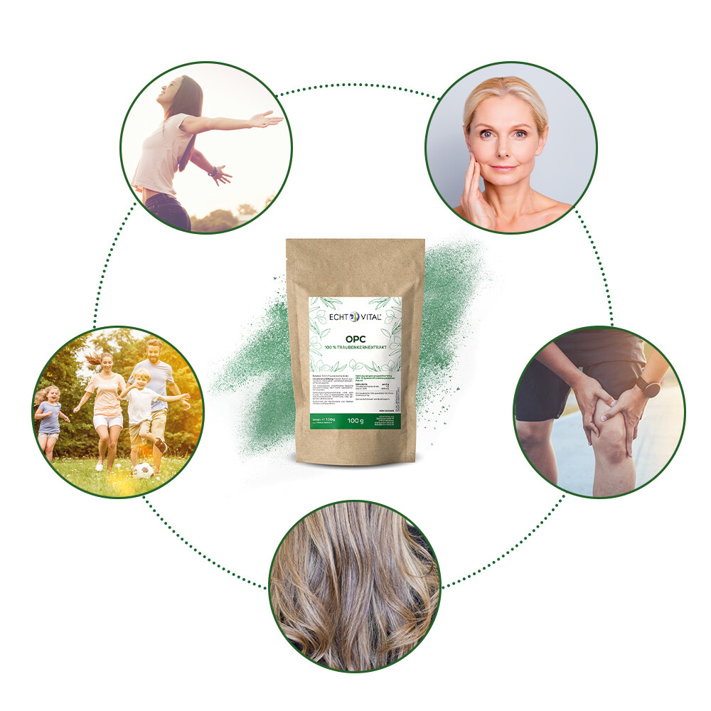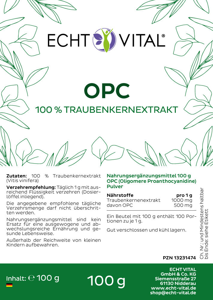 OPC steht für oligomere Proanthocyanidine - sekundäre Pflanzenstoffe aus den Kernen der Weintraube. Sie gehören zu den am besten erforschten Substanzen der Pflanzenwelt und gelten als natürlicher Schutzstoff. Echt Vital OPC Pulver Jacques Masquelier Edition liefert dir diese Substanz in konzentrierter Reinform. 1 g Pulver täglich reicht aus, um 500 mg reines OPC aufzunehmen. Wer OPC Pulver kaufen möchte, erhält hier kein Abfallprodukt aus der Weinherstellung, sondern klaren Extrakt aus französischen Traubenkernen