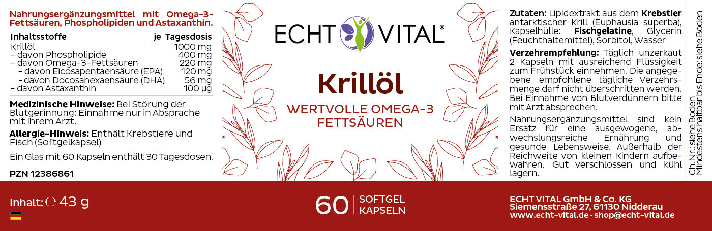 Echt Vital Krillöl Wal Edition liefert dir Omega-3-Fettsäuren in einer Form, die der Körper besonders gut aufnehmen kann: gebunden an Phospholipide. Jede Kapsel enthält EPA und DHA in natürlicher Struktur, dazu Astaxanthin als Schutz vor Oxidation. Im Unterschied zu herkömmlichem Fischöl gibt es keinen unangenehmen Nachgeschmack. Das Öl stammt aus antarktischem Krill (Euphausia superba) und wird unter pharmazeutischer Kontrolle in Deutschland verarbeitet. Wer Krillöl kaufen möchte, erhält hier ein Supplement, das Reinheit, Bioverfügbarkeit und Transparenz vereint - inspiriert vom roten Weg der Wale.