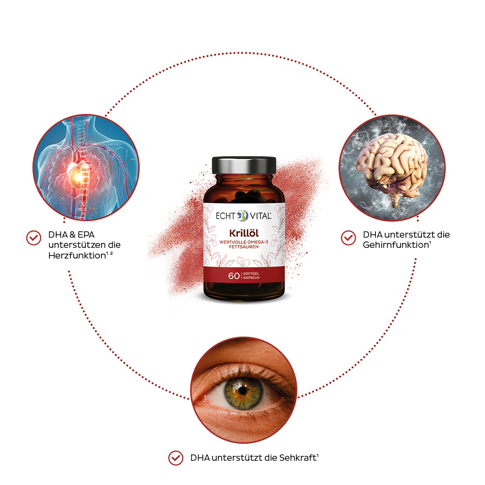 EPA und DHA tragen zur normalen Herzfunktion bei. DHA unterstützt zusätzlich die Erhaltung normaler Gehirnfunktion und normaler Sehkraft. Durch die phospholipidische Struktur ist Krillöl besonders gut bioverfügbar – der Körper erkennt es sofort. Echt Vital Krillöl Wal Edition liefert dir diese Fettsäuren in einer klaren, natürlichen Form. Wer Krillöl kaufen möchte, findet hier ein Supplement, das nicht in isolierten Tropfen kommt, sondern als vollständiger Lipidkomplex, der im Körper dorthin fließt, wo er gebraucht wird.