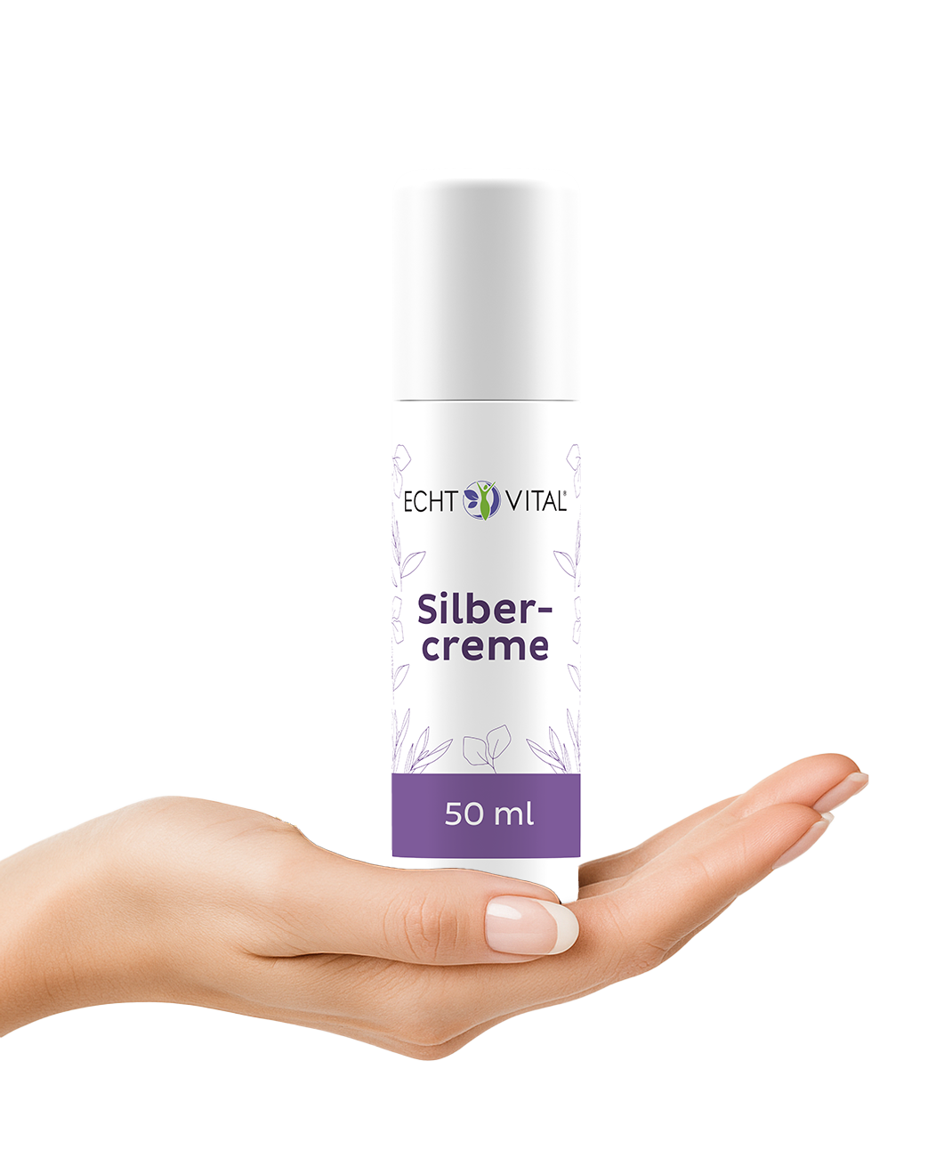 ECHT VITAL Silbercreme ist eine hochwertige Silbercreme mit wertvollem Panthenol. Wie der Name schon sagt ist der entscheidende Bestandteil der Creme "Silber". Sie ist unparfümiert, fettet nicht, zieht schnell in die Haut ein, ist geeignet für sensible und Problemhaut und auch als Deo-Creme verwendbar. ECHT VITAL Silbercreme besitzt einen neutralen pH-Wert zwischen 5 und 6. ECHT VITAL Silbercreme ist lichtempfindlich und wird deshalb im bequemen, lichtundurchlässigen Dispenser angeboten.