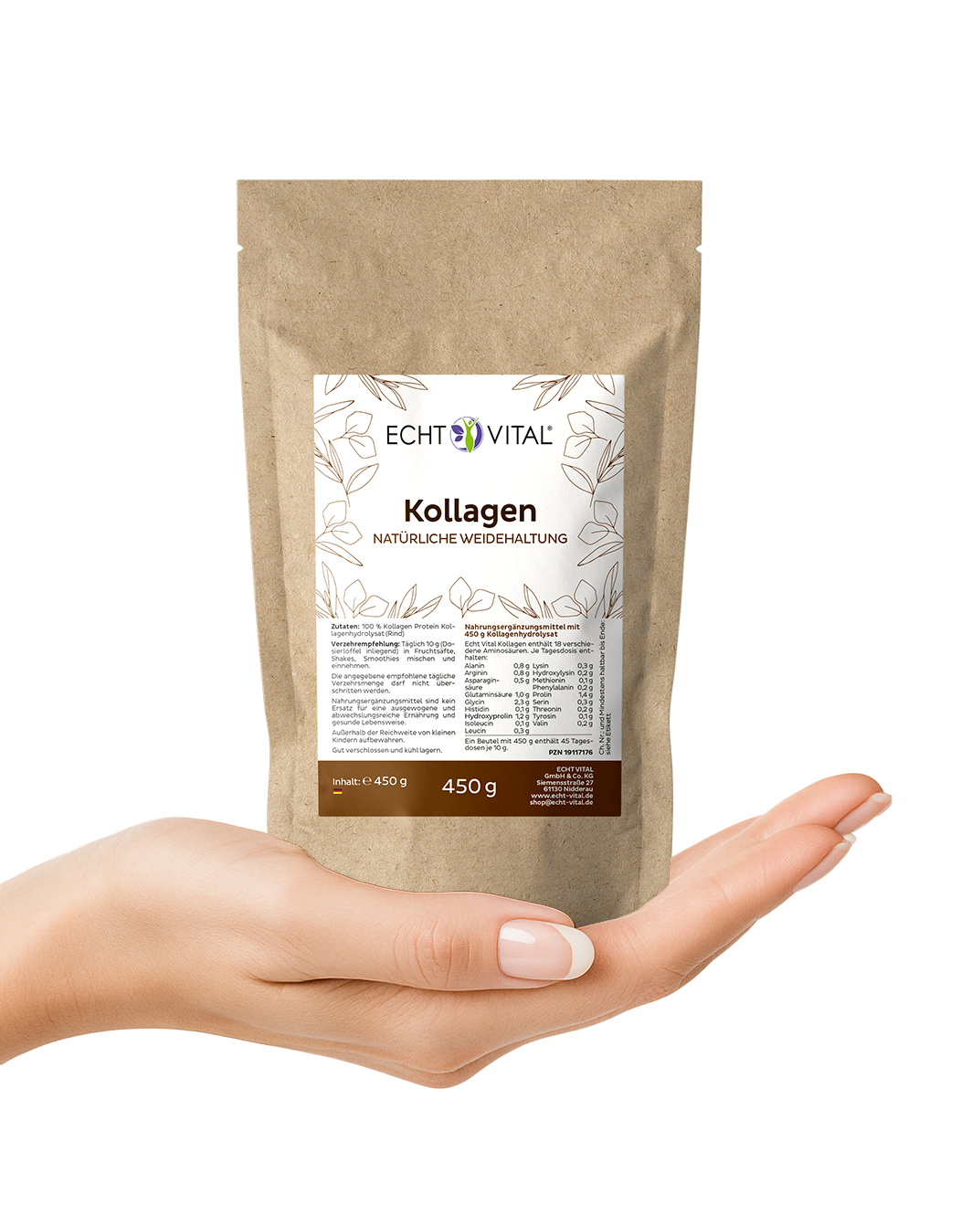 Viele Kollagenprodukte setzen auf Mischungen, tierische Nebenprodukte oder sind nicht klar deklariert. Echt Vital Kollagen Maria Edition setzt auf 100 Prozent Kollagenhydrolysat vom Rind, gewonnen aus Weidehaltung mit 365 Tagen Freiland. Frei von Hormonen, frei von Antibiotika, laborgeprüft und in Deutschland verarbeitet. Über 91 Prozent Protein, 18 Aminosäuren und die volle Transparenz in Herkunft und Herstellung. Wer Kollagen Pulver kaufen möchte, investiert hier nicht in ein Trendprodukt, sondern in ein Supplement, das Substanz, Reinheit und Klarheit in den Mittelpunkt stellt.