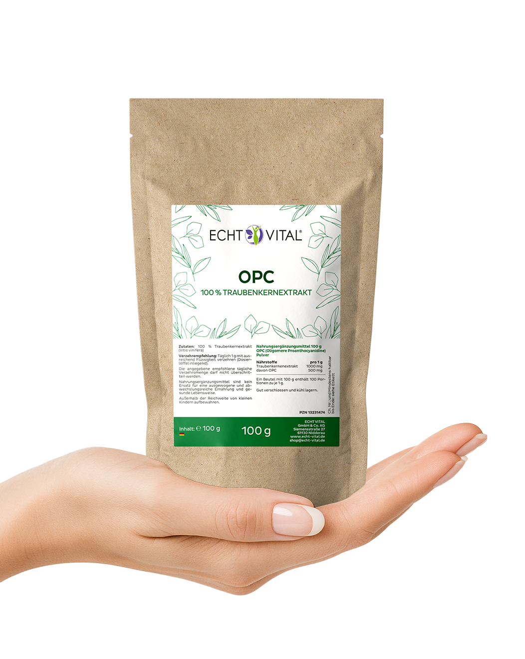 OPC steht für oligomere Proanthocyanidine - sekundäre Pflanzenstoffe aus den Kernen der Weintraube. Sie gehören zu den am besten erforschten Substanzen der Pflanzenwelt und gelten als natürlicher Schutzstoff. Echt Vital OPC Pulver Jacques Masquelier Edition liefert dir diese Substanz in konzentrierter Reinform. 1 g Pulver täglich reicht aus, um 500 mg reines OPC aufzunehmen. Wer OPC Pulver kaufen möchte, erhält hier kein Abfallprodukt aus der Weinherstellung, sondern klaren Extrakt aus französischen Traubenkernen