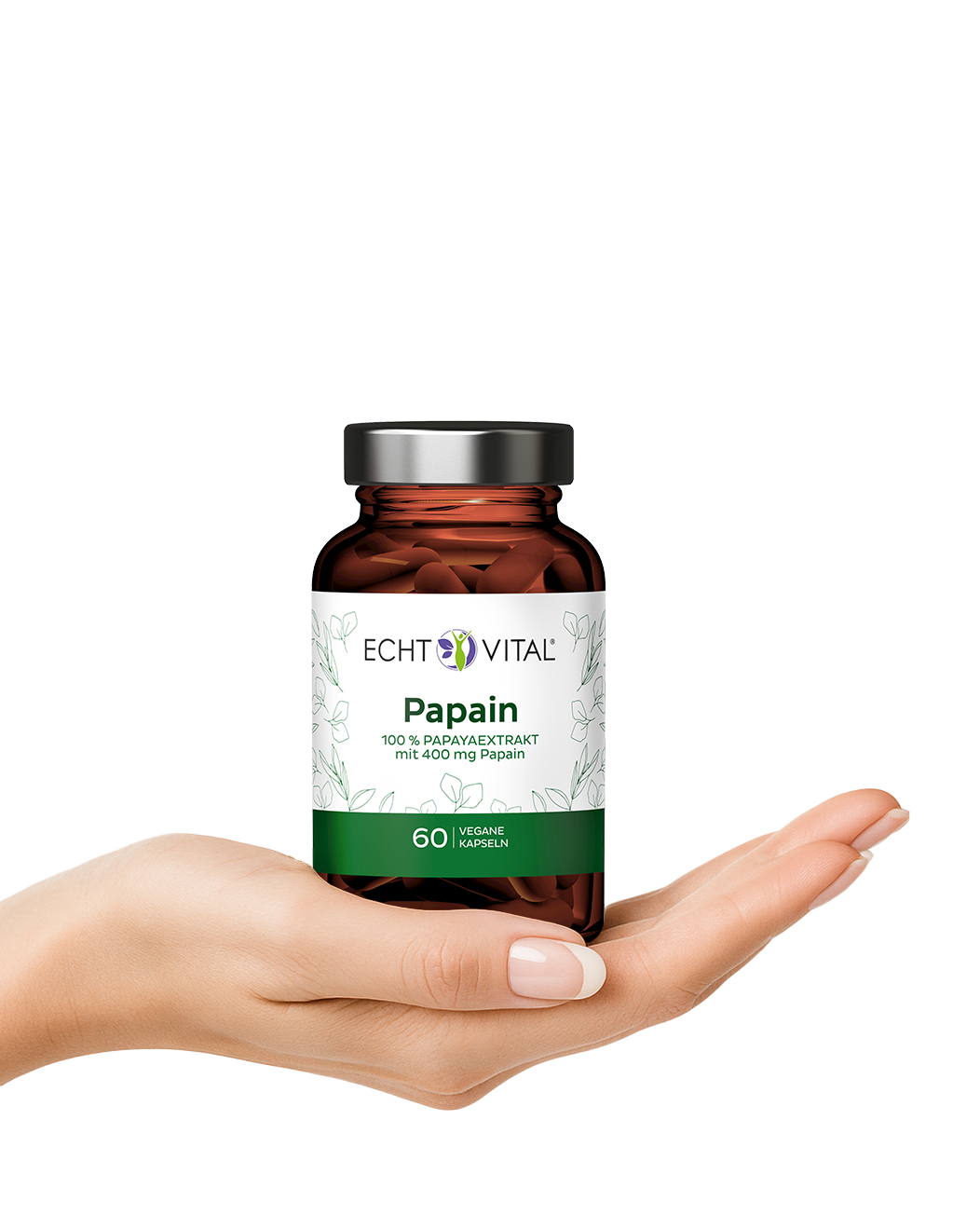Echt Vital Papain George Johnson Edition liefert dir 100 % Papayaextrakt, gewonnen aus unreifen Früchten samt Milchsaft, Schale und Kernen. In einem aufwendigen Verfahren wird der Extrakt im Vakuum getrocknet und mehrfach gereinigt. Zwei Kapseln täglich liefern dir 800 mg reines Papain. Vegan, frei von Magnesiumstearat, frei von Füllstoffen und hergestellt in Deutschland. Wer Papain kaufen möchte, erhält hier kein Trendprodukt, sondern ein Enzym, das seit Jahrhunderten von Naturvölkern genutzt und 1878 von George Johnson erstmals isoliert wurde
