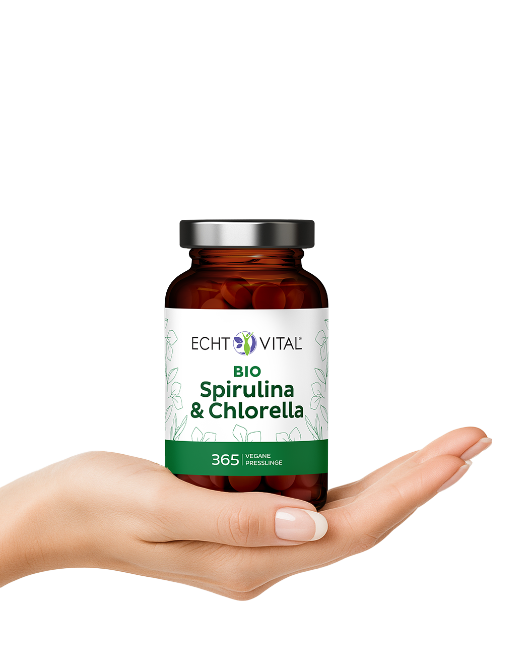 Echt Vital Bio Spirulina und Chlorella Großmutter Edition vereint zwei der ursprünglichsten Mikroalgen der Welt in reiner Form. Jede Tagesdosis liefert dir 3200 mg Mikroalgenkraft, gewonnen aus Arthrospira platensis (Spirulina) und Pyrenoidesa (Chlorella). Frei von Magnesiumstearat, frei von Trägerstoffen, ohne Pestizide oder Schwermetalle. Ein Glas enthält 365 Presslinge, genug für 45 Tage tägliches Ritual. Wer Spirulina und Chlorella kaufen möchte, erhält hier kein Mischprodukt mit Zusätzen, sondern ein Premiumsupplement, das auf 100 Prozent Bio, 100 Prozent pflanzlich und 100 Prozent Reinheit setzt.