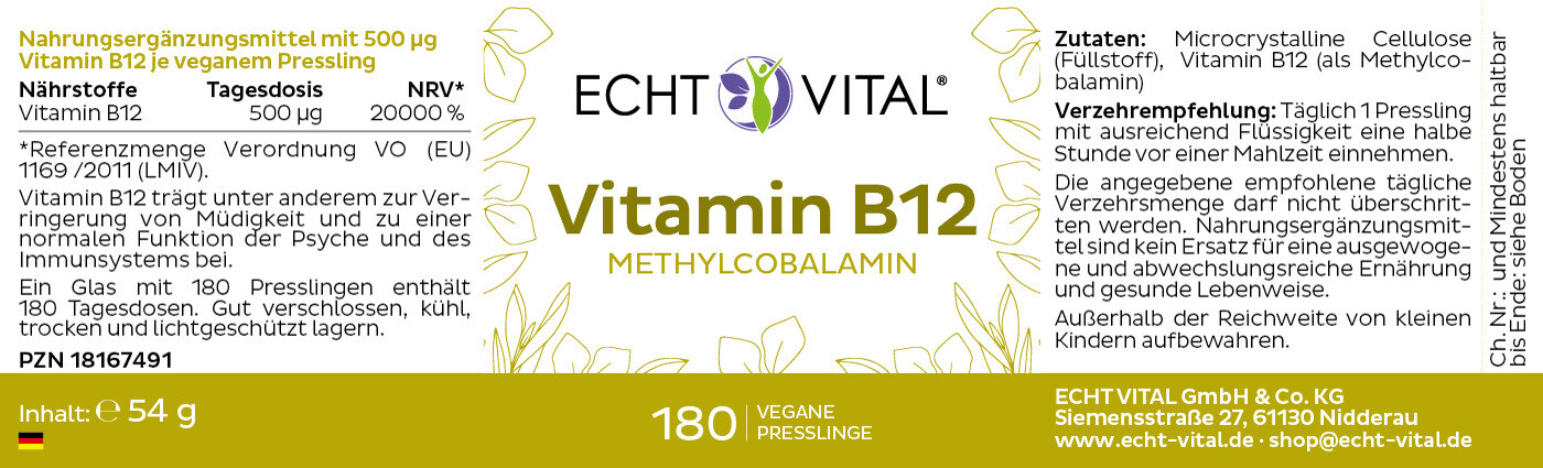 Viele Vitamin-B12-Präparate nutzen Cyanocobalamin oder enthalten unnötige Zusätze. Echt Vital ist anders: 500 µg Methylcobalamin pro Pressling, die aktive Form, hoch bioverfügbar, vegan, frei von Magnesiumstearat, hergestellt in Deutschland, laborgeprüft und lichtgeschützt verpackt. Wer Vitamin B12 kaufen möchte, investiert hier nicht in Umwege, sondern in die direkte Substanz - inspiriert von Dr. George Minot, der 1926 den unsichtbaren Mangel erstmals sichtbar machte