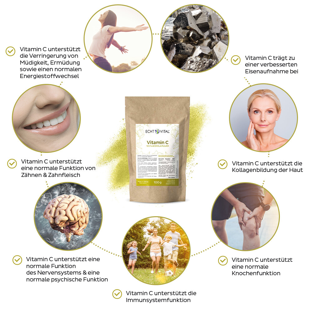 Vitamin C trägt bei zur normalen Funktion des Immunsystems, schützt Zellen vor oxidativem Stress, unterstützt die Kollagenbildung für Haut, Knochen und Knorpel, und verringert Müdigkeit und Ermüdung. Echt Vital Vitamin C Pulver aus Acerola Dr. Linus Pauling Edition fasst diese Funktionen in einer Portion reiner Fruchtkraft zusammen - kein Push, sondern tägliche Substanz