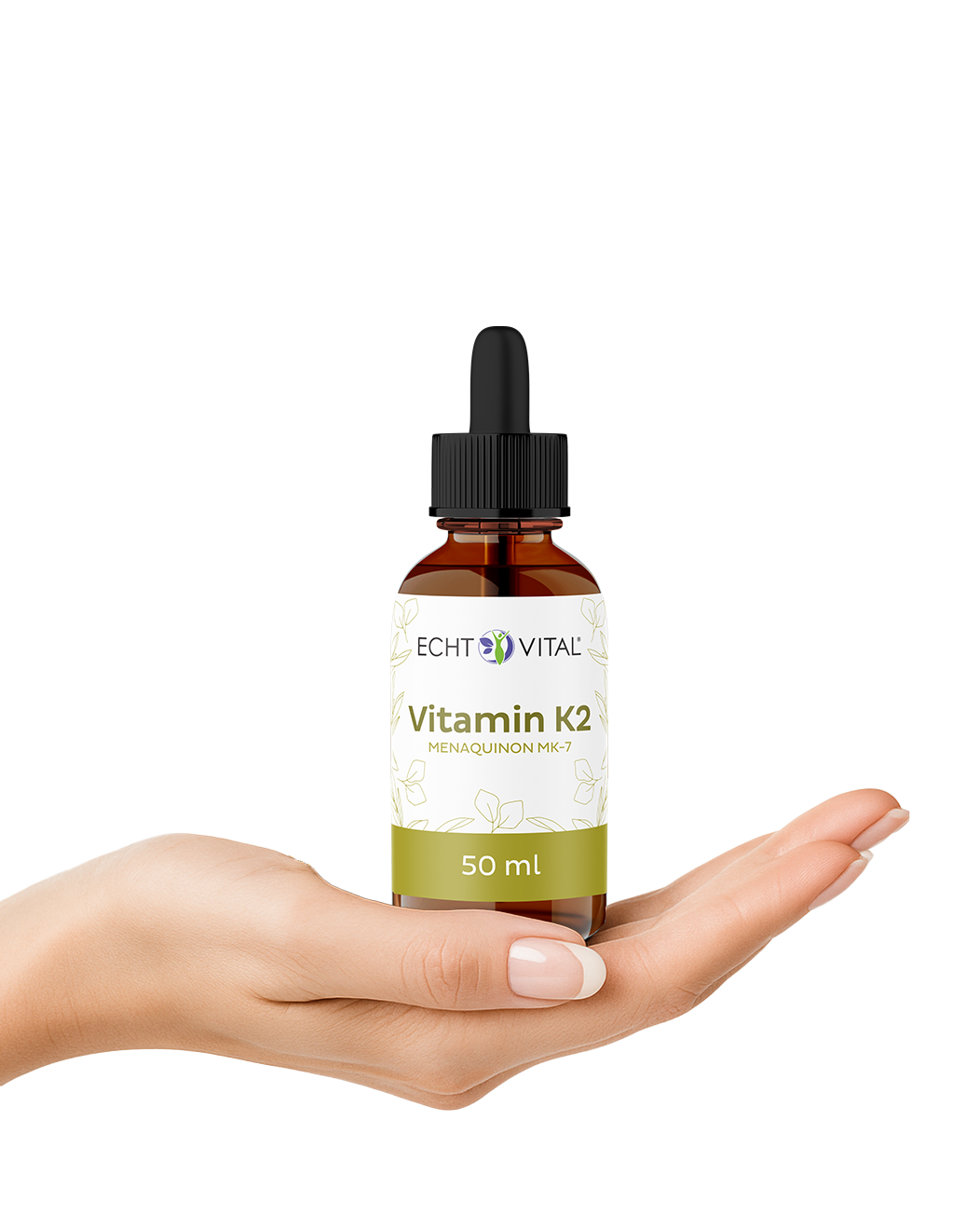 Echt Vital Vitamin K2 Tropfen liefern dir 200 µg MK-7 all-trans pro Tagesdosis. Diese Form gilt als die aktivste und stabilste, hoch bioverfügbar und aus natürlicher Fermentation gewonnen. Die Tropfen sind vegan, frei von Zusätzen und gelöst in hochwertigem Kokos-MCT- und Olivenöl. Eine Flasche mit 50 ml enthält 1250 Tropfen und reicht für 125 Tage. Wer Vitamin K2 kaufen möchte, erhält hier kein synthetisches Zufallsprodukt, sondern Reinheit und Präzision - inspiriert von Dr. Henrik Dam, der 1935 Vitamin K entdeckte